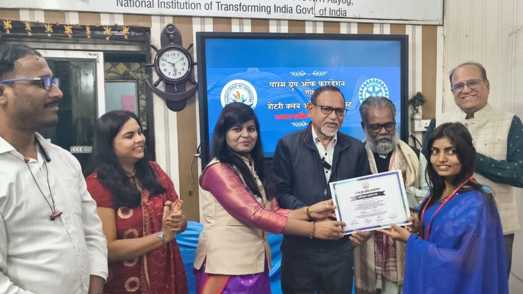 रायपुर। पारस ग्रुप ऑफ फाउंडेशन एवं रोटरी क्लब ऑफ रायपुर वेस्ट के संयुक्त तत्वावधान में संचालित निःशुल्क सिलाई प्रशिक्षण एवं निःशुल्क कंप्यूटर प्रशिक्षण कार्यक्रम के अंतर्गत प्रशिक्षण पूर्ण करने वाले विद्यार्थियों को प्रमाण पत्र प्रदान किए गए। यह कार्यक्रम रोटरी क्लब रायपुर वेस्ट, न्यू राजेन्द्र नगर में पारस ग्रुप ऑफ फाउंडेशन के माध्यम से निरंतर संचालित किया जा रहा है, जिससे बड़ी संख्या में बच्चे एवं महिलाएँ लाभान्वित हो रहे हैं।